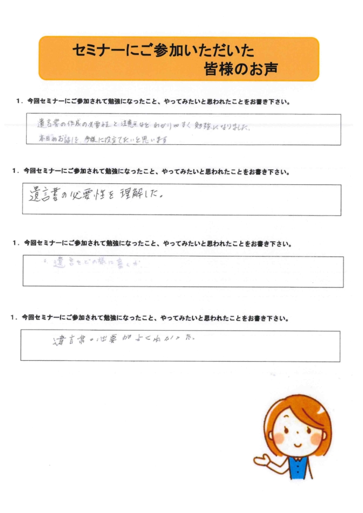遺言書の作成の必要性と注意点などわかりやすく勉強になりました。